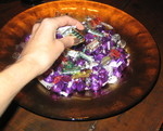 – You can’t get the chocolate out of your mind. You think “I’ll just have 2 little pieces”. But every time you walk by the kitchen or dining room your hand dips into the bowl. Before the weekend is over, half of the candy has moved from the bowls to your hips!