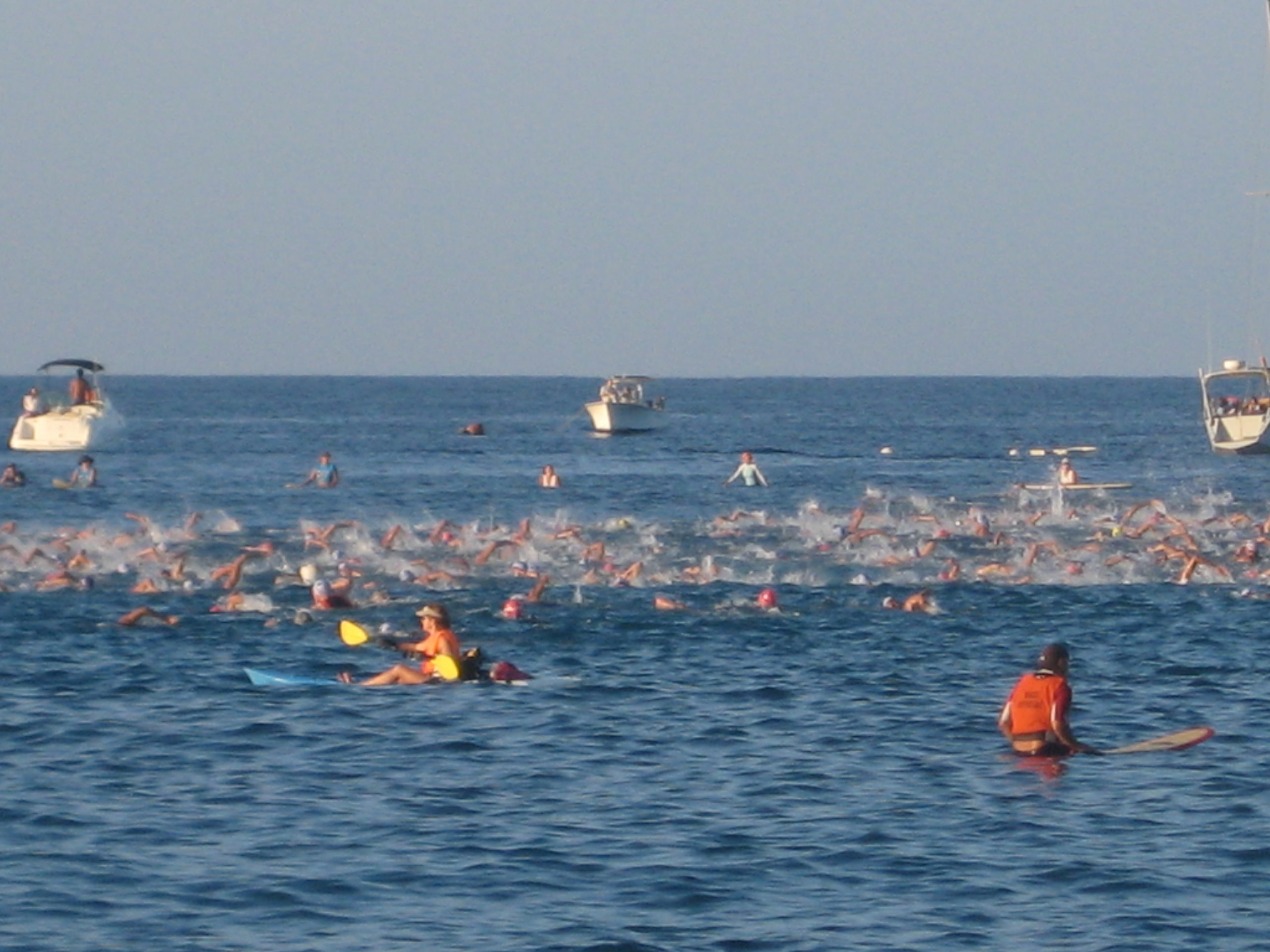 Dustin headed out to the race at 4:45 am for a 7 am swim start. His dad, myself and a couple of his friends were there to watch the gun go off at 6:30 am to signal the start of the race for the pros, followed by the amatuer at 7 am. All I can say is that I’m glad I wasn’t in the water! It was a mass start in a very small area. The field of ~ 1600 amatuer athletes had to get in the water at the same time. The water was deep so they had to tread water for 15 minutes practically on top of each other waiting for the gun to go off. I can’t even imagine what it was like to be in such close quarters with other swimmers treading water – not even to mention having to swim 2.25 miles after that!