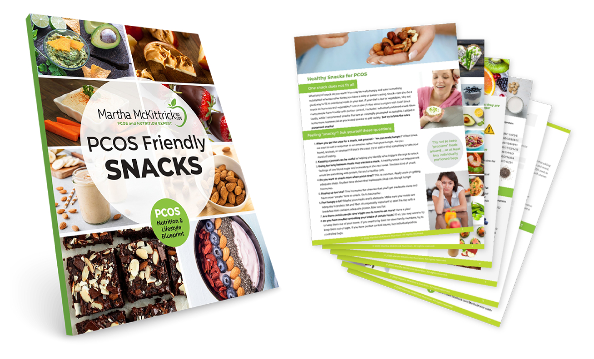 Looking For Ideas For PCOS-Friendly Meals And Snacks? Then you’ll love my new PCOS Meal and Snack Guides! The good news is that eating healthy can doesn’t have to be complicated. My Meal and Snack Guides are packed with foods that can improve hormone balance, decrease insulin resistance, douse inflammation and improve gut health. And you’ll get the nutritional content, including carbs and calories. These guides were created for my signature online course: The PCOS Nutrition & Lifestyle Blueprint. I’ve gotten such great feedback on them, I decided to offer them to you! And if you purchase them, you’ll get a discount on the course.