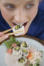 7. Miso soup and the green salad with dressing on the side are good low calorie fillers. Start with them and you will end up eating less at your meal. Your goal is to slow down your rate of eating. Eating your salad with chopsticks takes an even longer time (now who would use a knife and fork in a Japanese restaurant?)